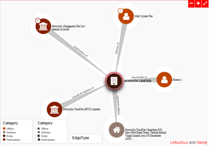 ACOUSTIC LIMITED appears as a central node in the ICIJ Offshore Leaks Database network graph, representing a British Virgin Islands entity with layered anonymity features characteristic of offshore structures. The visualization connects it directly to a Bearer 1 shareholder, signifying undisclosed beneficial ownership; Mary Lynne Tan as director appointed on October 24, 1994; and Portcullis TrustNet (BVI) Limited as the intermediary managing records and registers, forming a relational hub that emphasizes control delegation and administrative secrecy. This graph mapping elucidates the entity’s position within interconnected offshore networks, enabling analysts to trace officer and service provider links for deeper investigations into potential compliance risks.