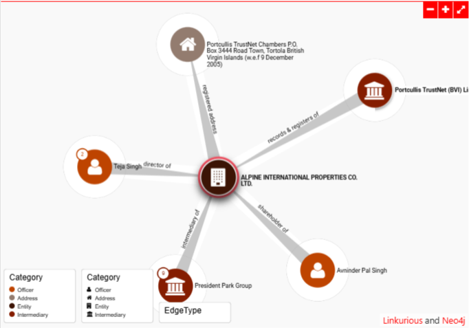 In the ICIJ Offshore Leaks Database network graph for ALPINE INTERNATIONAL PROPERTIES CO. LTD. (node 123970), the entity occupies a central position as a British Virgin Islands-incorporated company established on December 21, 1994, now listed as struck/defunct/deregistered, illustrating its role within a typical offshore structure for property-related holdings. Direct connections radiate to officers including Teja Singh as Director from incorporation date and Avninder Pal Singh as Shareholder, alongside intermediary Portcullis TrustNet (BVI) Limited handling records and registers, with an additional status link to President Park Group, mapping hierarchical relationships from control figures to service providers. The visualization employs nodes and edges to delineate these ties—entities in one cluster, officers and intermediaries in adjacent ones—revealing opaque ownership layers and potential address linkages common in such graphs, thus exposing the interconnected web of offshore anonymity for investigative scrutiny.