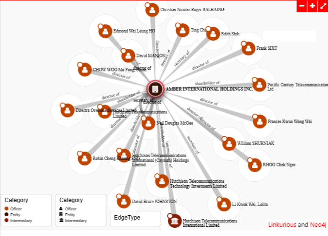 AMBER INTERNATIONAL HOLDINGS INC., identified as node 123823 in the ICIJ Offshore Leaks Database, emerges as a key entity within the Cayman Islands’ offshore network, primarily associated with Hutchison Telecommunications International Limited and exhibiting a complex web of corporate shareholders and personnel ties spanning from 1994 onward. Notable shareholders include Hutchison Telecommunications International (Cayman) Holdings Limited (from 2004), Hutchison Telecommunications Limited (1997-2004), Hutchison Telecommunications Technology Investments Limited (from 1995), and earlier Pacific Century Telecommunications Ltd (1994-1995), underscoring its integration into the Hutchison Group’s telecommunications infrastructure. The entity features a rotation of directors such as Ting Chan, Christian Nicolas Roger SALBAING, Robin Cheng Khoong SNG, Edmond Wai Leung HO, and others including CHOW WOO Mo Fong, Susan, alongside intermediaries like Directra Overseas Services Limited, secretaries including Edith Shih and Neil Douglas McGee, highlighting a professional cadre managing its operations amid shifting roles over decades.