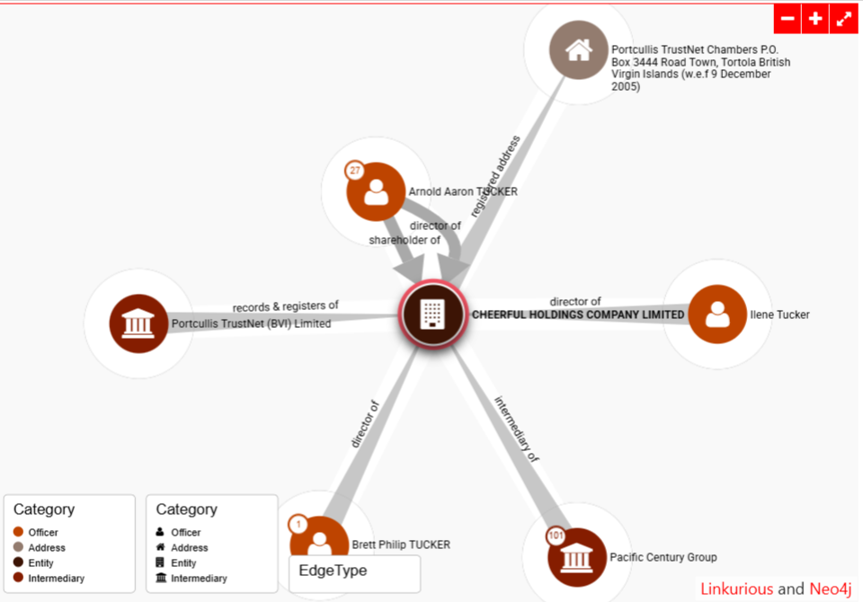 CHEERFUL HOLDINGS COMPANY LIMITED is an offshore entity registered in the British Virgin Islands, featured in the ICIJ Offshore Leaks Database. It is linked to multiple individuals serving key roles, including Ilene Tucker and Brett Philip Tucker as directors from the mid-1990s. Arnold Aaron Tucker appears as both a shareholder and director, indicating significant control within the company. The firm has records and registers maintained by Portcullis TrustNet (BVI) Limited, an intermediary known for providing offshore fiduciary services. Additionally, CHEERFUL HOLDINGS COMPANY LIMITED is connected to the Pacific Century Group, further embedding it within a broader offshore business network. This profile highlights the entity’s integration within typical offshore frameworks that facilitate complex ownership structures and anonymity commonly utilized for international financial arrangements.