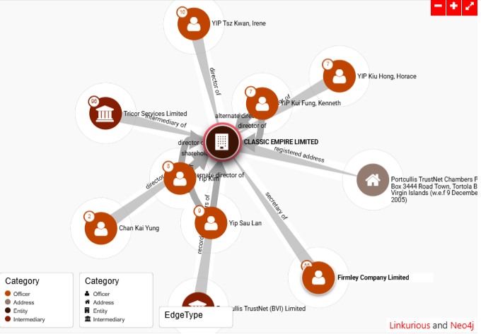The offshore entity “CLASSIC EMPIRE LIMITED,” as represented in its network graph from the ICIJ Offshore Leaks Database, serves as a central node within a structured offshore environment. The visualization highlights the company’s connections to a series of individual officers, primarily directors and alternate directors, many of whom share the surname Yip, such as YIP Kiu Hong Horace, YIP Tsz Kwan Irene, and Yip Kim, indicating a potential family or closely linked group managing the entity. The graph also reveals ties to intermediary service providers like Portcullis TrustNet (BVI) Limited and Tricor Services Limited, which are responsible for corporate governance and record-keeping functions. Address nodes associated with the entity depict registered office locations used for legal and administrative purposes. This network graph effectively maps the intricate relationships within the offshore structure, illustrating the layered connections between individuals, corporate roles, and intermediaries that together facilitate the operational framework and regulatory interface of “CLASSIC EMPIRE LIMITED” in the offshore financial system. The visualization provides valuable insight into how control, administration, and ownership are distributed within this offshore entity, typical of structures designed for confidentiality, asset protection, and strategic financial management.​