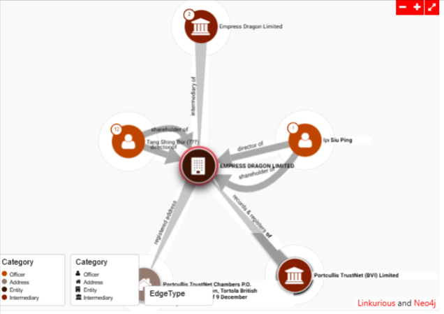 Empress Dragon Limited appears as a central node in the ICIJ Offshore Leaks Database network graph, illustrating its position within an opaque offshore structure likely incorporated in a British Virgin Islands jurisdiction, given its association with service providers like Portcullis TrustNet (BVI) Limited. The visualization maps direct connections to officers Ip Siu Ping, who held roles as director from 2003-08-04 to 2007-08-29 and shareholder from 2003-08-04 onward, and Tang Shing Bor (with noted alternate identifiers), serving as director from 1996-03-26 to 2003-08-04 and indefinite shareholder. Portcullis TrustNet (BVI) Limited links as the intermediary for records and registers, highlighting the entity’s reliance on corporate service providers to maintain secrecy, while the graph’s edges denote hierarchical relationships—officers linked to the company and intermediary oversight—exposing potential layers of control typical in offshore networks designed for anonymity.