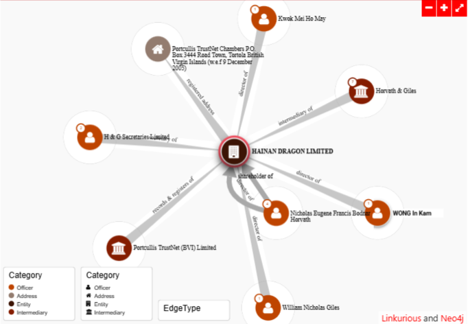 Hainan Dragon Limited, a British Virgin Islands-incorporated entity featured in the ICIJ Offshore Leaks Database, occupies a central node in its network graph, illustrating its connections to a series of directors, shareholders, secretaries, and intermediaries that form a classic offshore administrative structure. The visualization prominently links Nicholas Eugene Francis Bodnar Horvath as both long-term director and shareholder since 1995-06-08, alongside successive directors William Nicholas Giles (1995-06-08 to 2007-03-31), Kwok Mei Ho May (2007-11-08 to 2008-05-08), and WONG In Kam (from 2008-06-30), with H & G Secretaries Limited serving as secretary since 2003-01-01. Intermediaries such as Portcullis TrustNet (BVI) Limited, responsible for records and registers, and the status indicators “Horvath & Giles” and Portcullis TrustNet further map the entity’s reliance on professional service providers, while any associated addresses—typically standard BVI registered office locations—underscore its embedded position within global offshore networks. This graph effectively reveals the layered relationships and personnel overlaps that characterize opaque offshore entities.