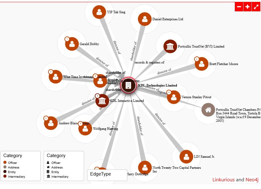 KDL Technologies Limited is an offshore entity registered in the British Virgin Islands, featured prominently in the ICIJ Offshore Leaks Database as node 124108, with records maintained by Portcullis TrustNet (BVI) Limited. Incorporated around 1995 based on initial director appointments, it exhibits a complex network of multiple directors—including Wolfgang Haering, Brett Fletcher Moore, Vernon Stanley Pitout, Andrew Blaise Jillings, Scott Craig Deerwester (also a shareholder), Christopher Harry Dottridge, LIN Samuel Jr., YIP Tak Sing, and Gerald Dobby—along with shareholders such as Daniel Enterprises Ltd, North Twenty Two Capital Partners Inc, Wise Time Investments Limited, and KDL Interactive Limited, which also serves as an intermediary. This structure underscores its integration into broader offshore corporate webs, potentially involving nominee services and layered ownership typical of secrecy jurisdictions.