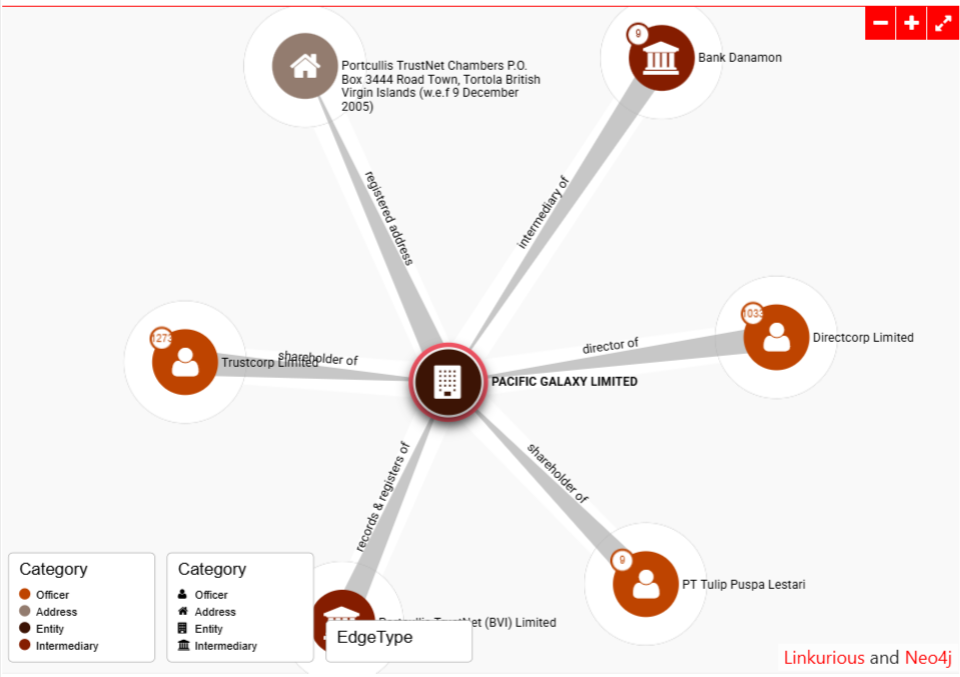 PACIFIC GALAXY LIMITED is an offshore entity documented in the ICIJ Offshore Leaks Database, reflecting its involvement in complex offshore networks. The entity is linked to various officers and intermediaries, including roles held by PT Tulip Puspa Lestari as a shareholder, Directcorp Limited as a director since January 1994, and Trustcorp Limited also as a shareholder. Additionally, Portcullis TrustNet (BVI) Limited is connected as the records and registers holder and appears as an intermediary, alongside Bank Danamon. This overview indicates PACIFIC GALAXY LIMITED’s embeddedness within a structured offshore framework involving multiple jurisdictions and service providers, reflecting typical characteristics of offshore entity networks used for various financial and corporate purposes. Further details of its relationships and roles are detailed in subsequent data tables.